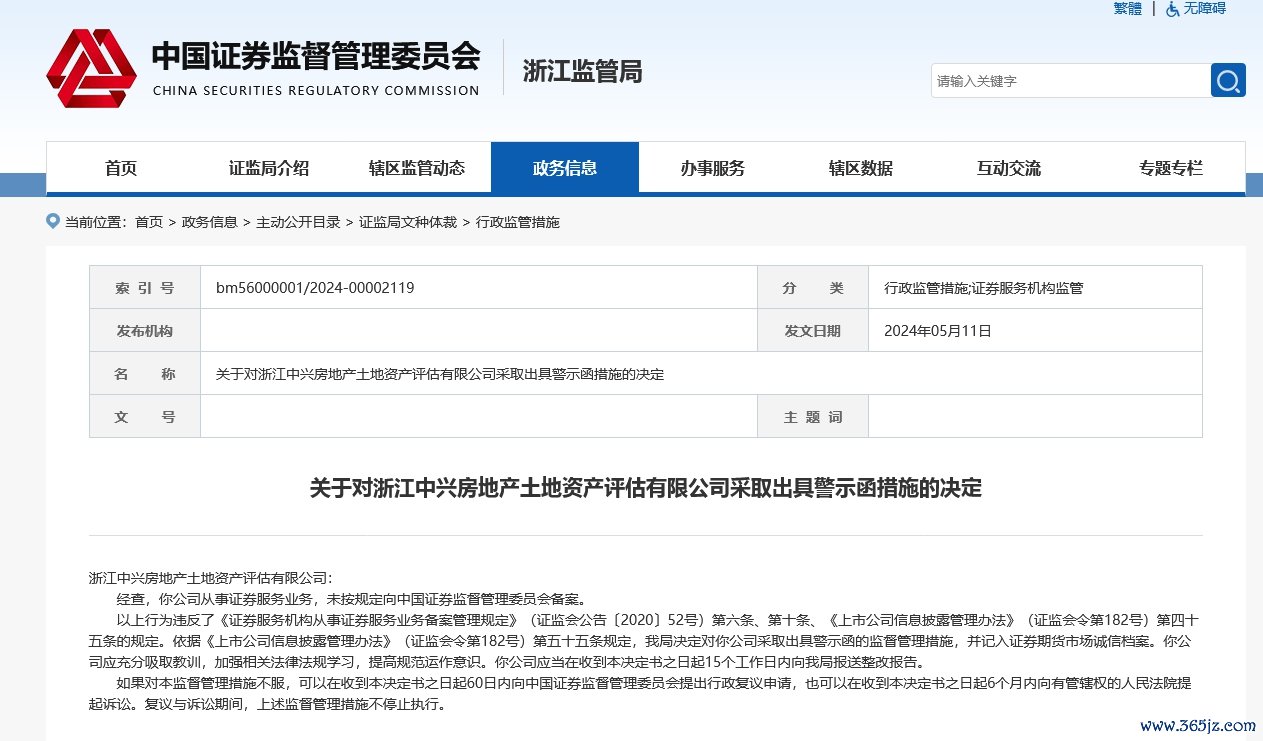 浙江证监局网站11日公布的监管信息显示,经查,浙江中兴房地产评估公司从事证券服务业务,未按规定向中国证券监督管理委员会备案。